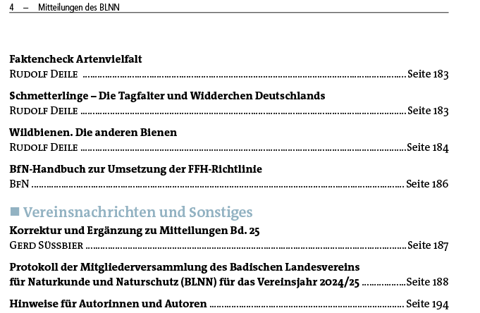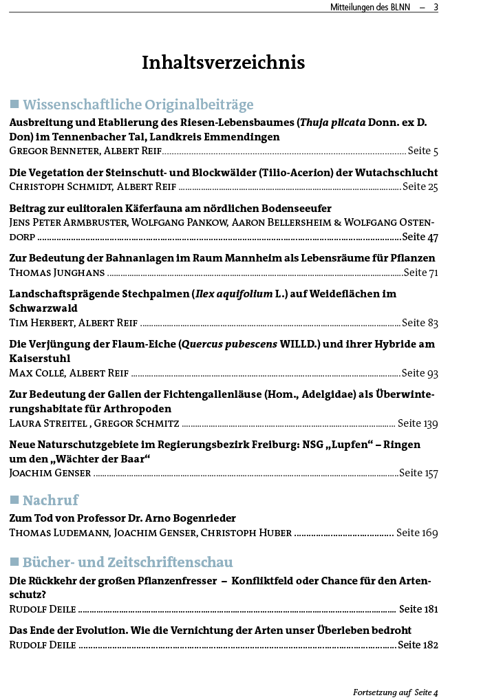 Alljährlich gibt der BLNN die Mitteilungen heraus, die wissenschaftliche Originalbeiträge zu Geologie, Geographie, Fauna und Flora Südwestdeutschlands publizieren. Die BLNN-Mitteilungen erscheinen bereits seit 1882 in regelmäßiger Folge abgesehen von kriegsbedingten Unterbrechungen. Sie sind daher ein einzigartiges Dokument der Veränderungen, die sich in den vergangenen hundertvierzig Jahren in unserer Landschaft, ihrer Vegetation und Fauna, abgespielt haben. Außerdem berichten die Mitteilungen über Exkursionen, Vereinsversammlungen, Personalia und vieles andere mehr. Abgeschlossene Manuskripte werden als Preprints vor der Drucklegung digital auf dieser Homepage veröffentlicht. Autoren sind mehrheitlich BLNN-Mitglieder, die ihre Manuskripte unentgeltlich zur Verfügung stellten. Die Mitgliedschaft im BLNN schließt den kostenlosen Bezug der Mitteilungen des Badischen Landesvereins für Naturkunde und Naturschutz ein.